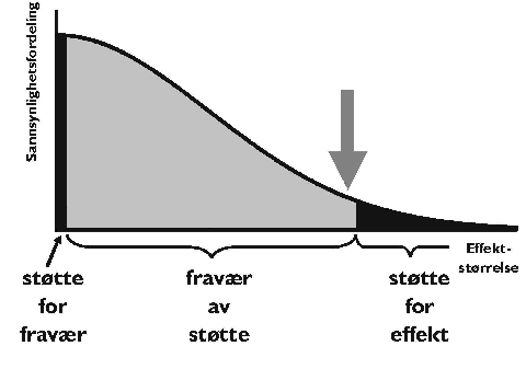 Figur 2. «Fravær av støtte» (for en effekt) er ikke «støtte for fravær» (av en effekt). Kurven viser en sannsynlighetsfordeling av effektstørrelser gitt nullhypotesen («ingen effekt»). De svarte arealene viser de ytterste fem prosentene av fordelingen, som vanligvis tolkes som støtte for effekten resp. dens fravær. I den mellomliggende grå sonen kan verken effekten eller dens fravær anses som støttet. Pilen illustrerer effektstørrelsen av en tenkt farlig effekt, som ikke har fått tilstrekkelig støtte, men som heller ikke kan motbevises. Kilde: originalillustrasjon ved forfatteren.