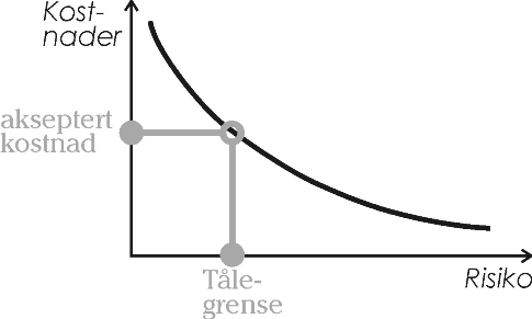 Figur 1. Samspill mellom forskning og politikk i og fastsette tålegrenser. Vitenskapens bidrag er vist i svart, politikkens i grå. Moralske verdier kan ikke avgjøre noen tålegrense uten vitenskapelige innspill. Men vitenskapen kan ikke avgjøre balansen mellom kostnad og risiko uten moralske/politiske innspill. Figuren er forenklet, siden kurven kan ha en atskillig mer komplisert form. Kilde: forfatterens egen illustrasjon, først publisert i Klassekampen (Sandvik, 1998).