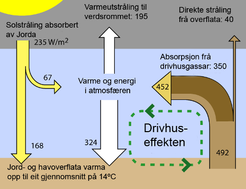 Figur 1 Den naturlige drivhuseffekten. Figuren viser energiflyten mellom verdensrommet og jorden samt i atmosfæren, alle verdier er i watt per kvadratmeter. Solens stråling alene varmer opp jorden til −18 °C (mot verdensrommets −270 °C). Jordens atmosfære «resirkulerer» en del av denne energien og øker derved temperaturen ytterligere til gjennomsnittlig +14 °C. Den menneskeforsterkede drivhuseffekten består i at menneskelig utslipp har endret atmosfærens sammensetning, noe som øker andelen av energien som blir resirkulert. [Kilde: modifisert etter Robert A. Rohde; tilgjengelig via wikipedia; filnavn: Drivhuseffekt.png]