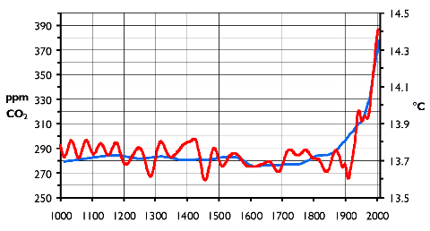 Figur 2 Den blå kurven og venstre y-aksen viser økningen i atmosfærens karbondioksidkonsentrasjon gjennom de siste tusen år. Rekonstruksjonen av historiske CO2-konsentrasjoner bygger på analyser av luftbobler i isen fra Antarktis. Den røde kurven og høyre y-aksen viser økningen i jordens gjennomsnittstemperatur. Jo lenger tilbake man går i tid, desto mer usikre blir verdiene. Merk også at den tydelige samvariasjonen mellom CO2 og temperatur alene ikke dokumenterer noen årsakssammenheng. Sistnevnte er imidlertid godt sikret gjennom lab-eksperimenter, modellering og sammenlignende feltstudier. [Denne og de følgende figurene er laget av forfatteren og kan fritt lastes ned på wikipedia.org (jf. sluttnoten). Denne figurens filnavn: CO2-Temp.png]
