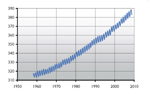 Figur 3 Siden 1950-tallet har man målt karbondioksidkonsentrasjonen i atmosfæren (angitt i ppm på y-aksen). CO2-nivået i atmosfæren var 280 ppm før den industrielle revolusjonen (jf. Figur 2). Konsentrasjonen krysset 380 ppm mellom 2004 og 2006. De små årlige svingningene som man ser på figuren, skyldes årstidsrelaterte variasjoner i plantenes CO2-forbruk. Derfor synker konsentrasjonen når det er sommer på Nordhalvkula. [Denne figuren er laget av forfatteren og kan fritt lastes ned på wikipedia.org (jf. sluttnoten). Figurens filnavn: CO2-Mauna-Loa.png]