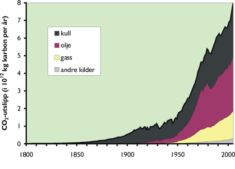 Figur 4 Menneskelige karbondioksidutslipp siden begynnelsen på den industrielle revolusjonen, uttrykt i gigatonn per år, og spesifisert etter kilde. De samlede utslippene frem til i dag er på omlag 345 gigatonn. Derav står Norge for 550 megatonn – mer enn det dobbelte av hva befolkningen skulle tilsi. [Denne figuren er laget av forfatteren og kan fritt lastes ned på wikipedia.org (jf. sluttnoten). Figurens filnavn: CO2-src.png]