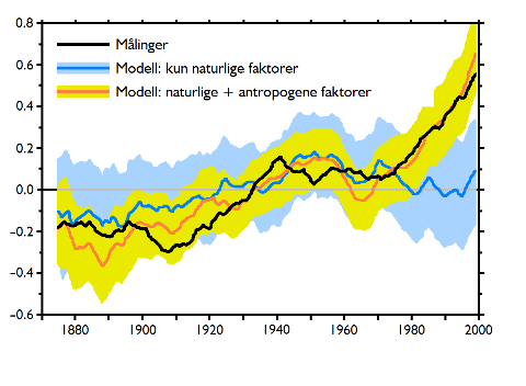 Figur 5 Målinger og modeller av temperaturøkningen på 1900-tallet. Modeller som utelater menneskelige eller naturlige årsaker, er ufullstendige (blå kurve), men kombinert (rød kurve) gir de en god forståelse av temperaturendringene (svart kurve). Man ser også at den bratte stigningen etter 1980 overveiende skyldes mennesket. Temperaturen (y-aksen) er angitt som avvik fra gjennomsnittstemperaturen i hele perioden, målt i °C. De fargede båndene er konfidensintervaller, dvs. angir modellenes respektive feilmarginer. [Modifisert etter: Stott m.fl. (2006) Transient climate simulations with the HadGEM1 climate model. Journal of Climate 19, 2763–2782. © 2006 American Meteorological Society. Gjengitt med forfatternes og utgiverens vennlige tillatelse.]