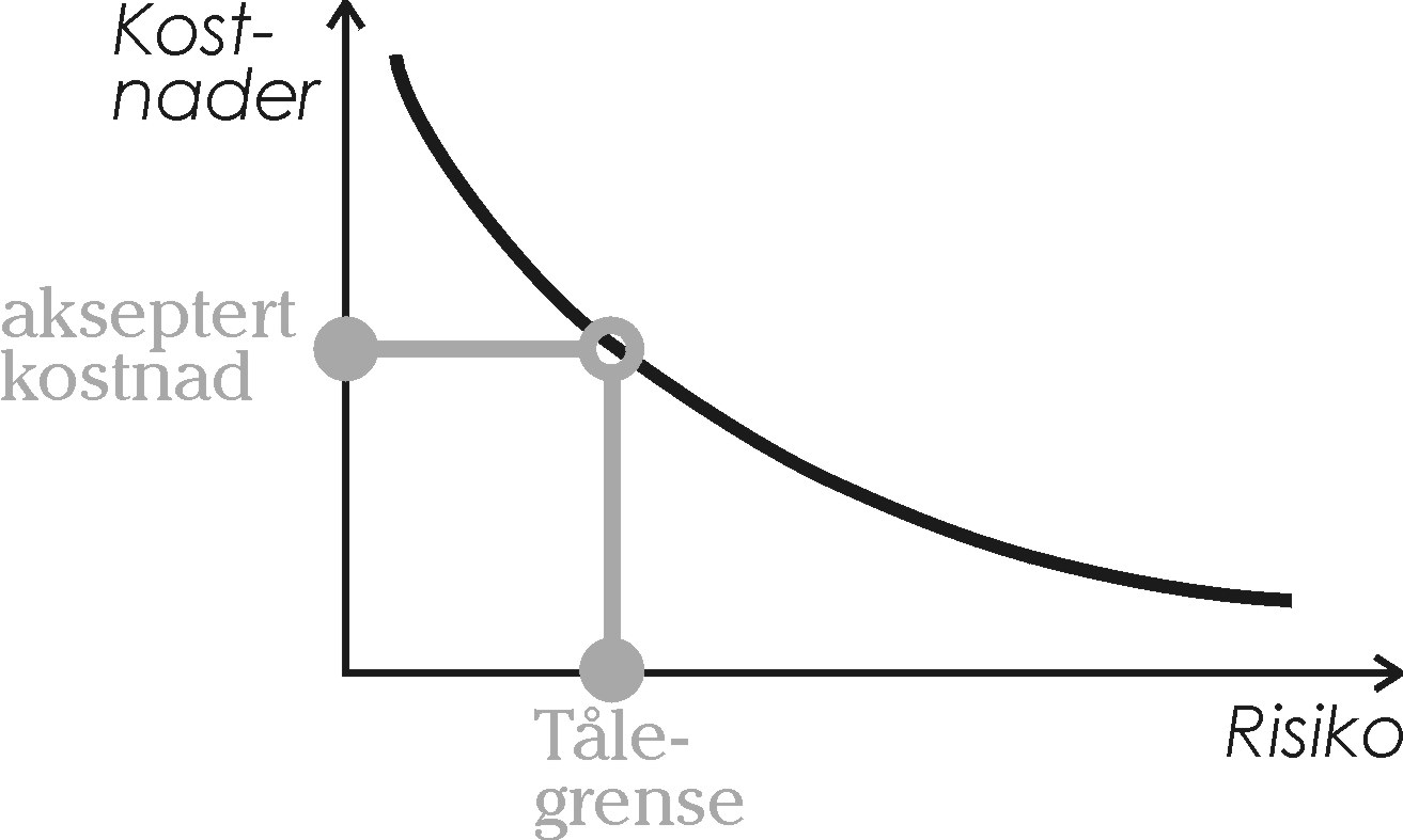 Det er slike sammenhenger som forskere kan finne ut, f eks ved hjelp av dyreforsøk. De kan også finne ut hva det ville koste å redusere konsentrasjonen av et stoff i luften, i vannet, i jorden eller maten. Resultatet er en kurve som i figuren: Forskeren finner ut hvordan kostnader for å unngå et problem henger sammen med problemets risiko. Men denne kurven forteller oss ikke hva som er den «riktige» tålegrensen. Å finne fram til en tålegrense innebærer at man må bruke kurven til å avveie to samfunnsmessige goder mot hverandre – billig vann eller mat mot helse, billig strøm mot uforandret klima, mobilitet mot ren luft osv. Disse avveiningene kan ikke forskeren foreta, de ligger utenfor vitenskapens kompetanseområde. Slike avveininger må samfunnet ta stilling til. Det er altså for kort tenkt å kritisere forskere for at de kynisk justerer tålegrenser etter økonomiske hensyn. Forskerne gjør dette etter at staten eller andre «samfunnsorganer» har vendt seg til forskeren og spurt: «Hva er tålegrensen til stoff X hvis vi kan akseptere en kostnad på k?» Forskeren tar ikke stilling til om spørsmålet er berettiget (hvis hun gjør det likevel, så pga samfunns-, og ikke pga forskningsengasjement), men ser bare etter krysningspunktet mellom «akseptert kostnad» og kurven hun har kommet fram til.